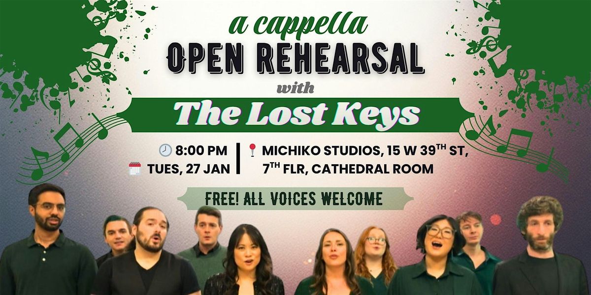 Always wondered what it would be like to be in an a cappella group? Whether you're thinking of auditioning or are an aca-fan, join The Lost Keys on January 27 at 8pm for a night of beautiful music to kick off the new year. At our Open Rehearsal, we invite you to warm up with us, learn some songs, sing along, or simply bop around as you hang with the Keys for a casual, acoustic, collaborative performance. *Participate or simply just watch!* Q&A and mingling after we wrap up - no tickets required, but please RSVP!
