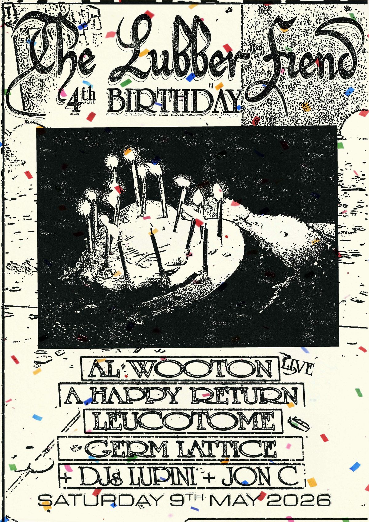 Full send for our 4th Birthday! We have gone big this year, what with it being the very notable 4th year of our existence. Its an absolute privilege for us to run the venue and to book artists that we love, and each year the birthday is meant to be a real celebration of what we do. Hard to argue with this years line up! We have Al Wooton headlining with his serpentine heads down Dub-Techno, Germ Lattice bring the wonkiest post-punk, A Happy Return is a beautiful homespun kind of minimal folk and Leucotome self describe as a Organic Industrial Femme Folk Cult. As if that wasn't enough, we're staying open late-late with the wonky post-everything sounds of the NTS resident Lupini and house fiend Jon C.Al Wootton is a producer, DJ, artist and operator of the record labels TRULE and Amidah Recordings. Through his own releases and those on his label he navigates the zone between Techno, Dub, UK Garage, and sparse, hypnotic percussion workouts. He is also one third of the band Holy Tongue. https://alwootton.bandcamp.com...