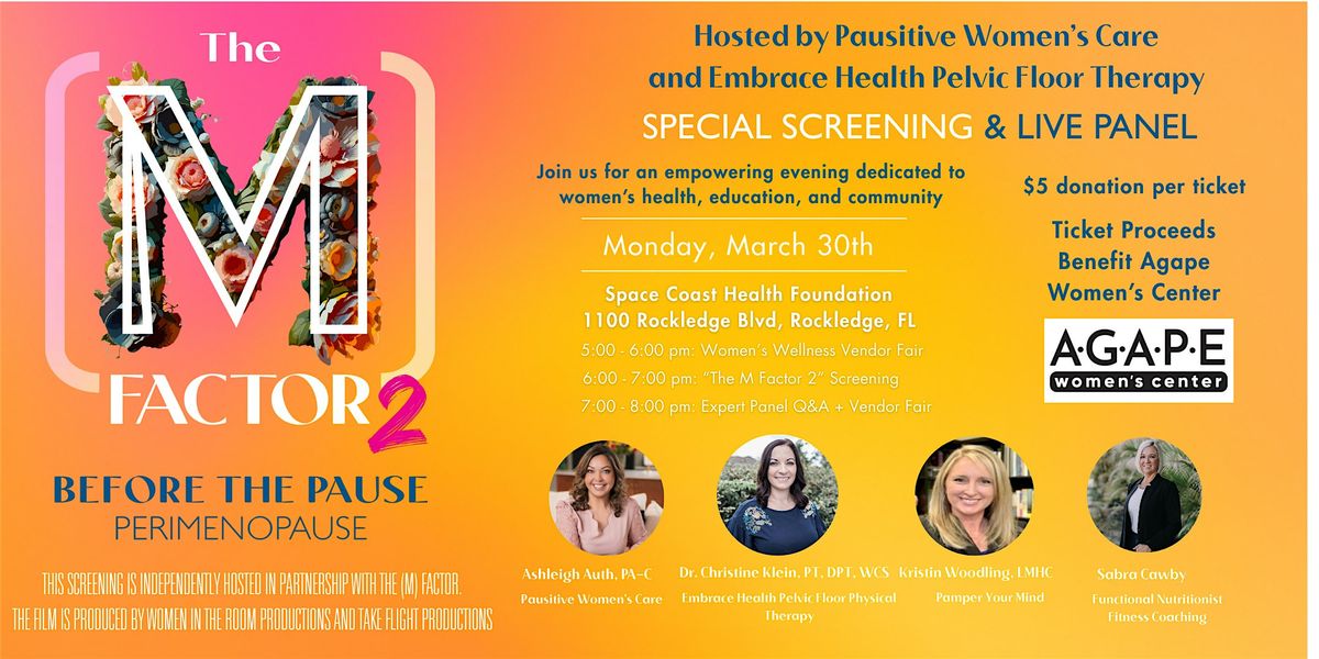 Join us in person for a relaxed and insightful evening all about perimenopause. Enjoy learning what our community has to offer our perimenopausal community through our local vendors, watch M Factor 2 together followed by a live Q&A discussion with an expert panel featuring Ashleigh Auth, PA-C (Pausitive Women's Care - Menopause expert), Dr. Christine Klein (EMBRACE Health & Rehab - Pelvic Floor PT), Dr. Kristin Woodling (Pamper Your Mind - Mental Health Counseling) and Sabra Cawby, (Sabra Cawby Wellness - Functional Nutritionist and Fitness Coaching)