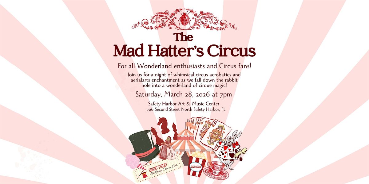 You’re invited down the rabbit hole to The Mad Hatter’s Circus- a night of whimsical wonder, topsy-turvy magic, and curious delights! Join us Saturday, June 7, at 7:30pm at the magnificent Safety Harbor Art & Music Center in downtown Safety Harbor, FL. Doors open at 7pm.