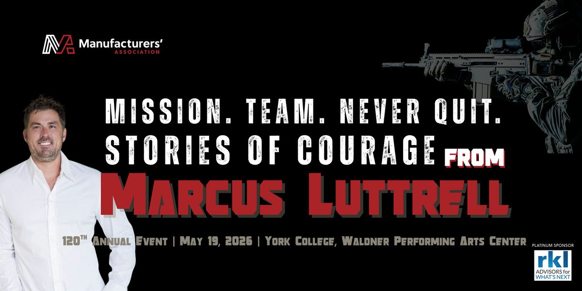 Join us for the Manufacturers Association’s 120th Annual Event, a celebration of more than a century of supporting and strengthening the region’s manufacturing community. This year featuring special guest, Marcus Luttrell, retired Navy SEAL and author of Lone Survivor, who will share a powerful message on courage, resilience, and leadership. The evening includes VIP and general receptions, networking opportunities, and a program designed to inspire and elevate our workforce and community.