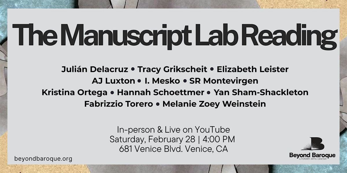 Join us in celebrating the completion of the 2026 cycle of The Manuscript Lab at Beyond Baroque! Participants from this year's cohort will give readings in The Wanda Coleman Theater highlighting the work they have accomplished this cycle. Participants from last year's cohort will join them to present what they've achieved since completing the Lab. Featured readers are Julián Delacruz, Tracy Grikscheit, Elizabeth Leister, AJ Luxton, I. Mesko, SR Montevirgen, Kristina Ortega, Hannah Schoettmer, Yan Sham-Shackleton, Fabrizzio Torero, and Melanie Zoey Weinstein.