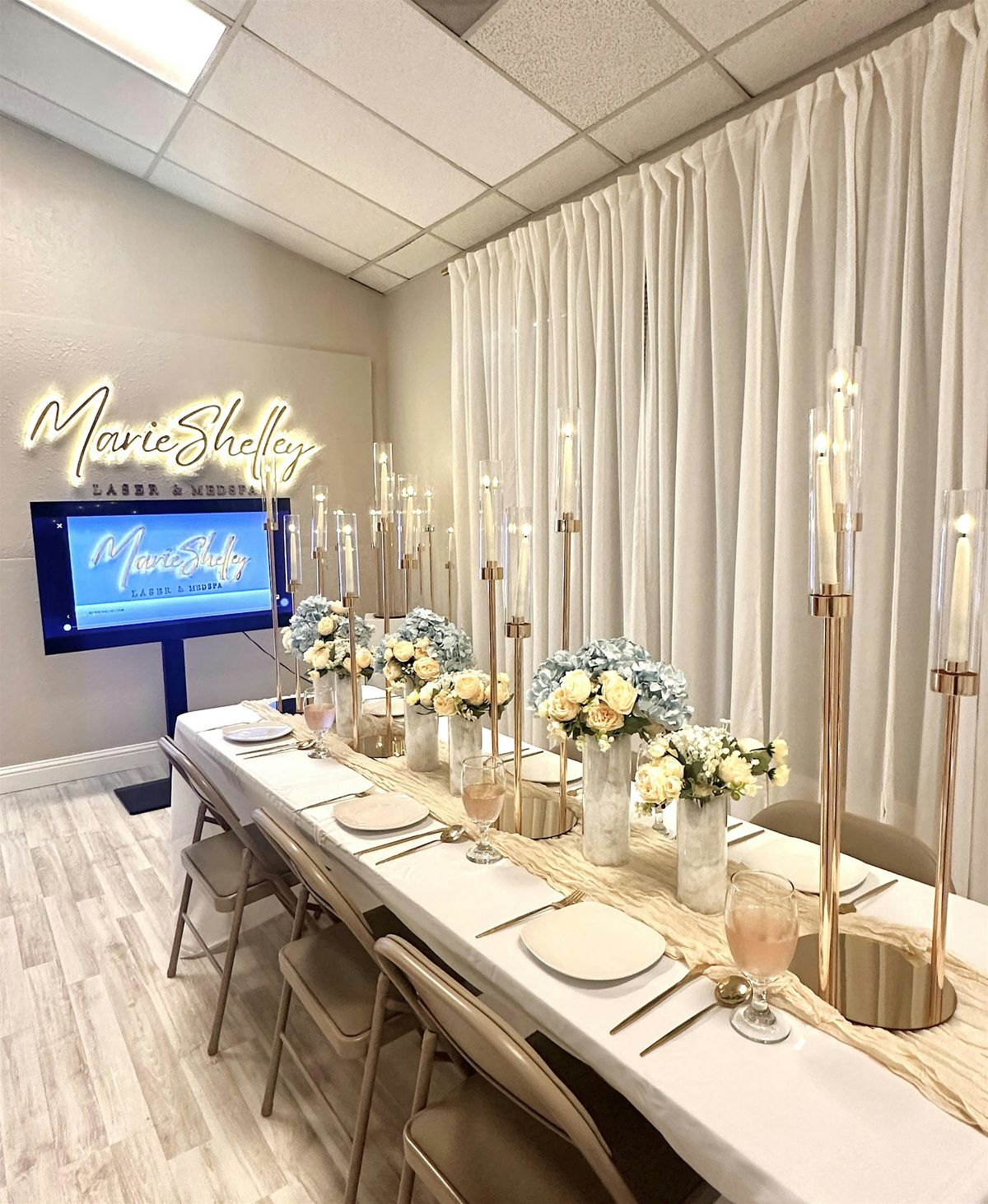 Enjoy a beautifully curated setting inside Marie Shelley Laser and Medspa with mocktails, light bites, and an intimate atmosphere.