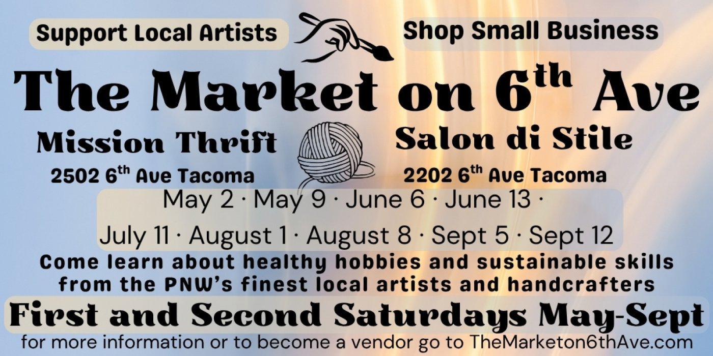 The Market on 6th Ave is a fun and free event for people of all ages hosted by Mission Thrift and Salon di Stile every First and Second Saturday May through September. Come learn about healthy hobbies and sustainable skills with over 25 of the PNW's finest local artists and crafters. Support small business and local artists at this strictly-handmade art & crafts fair. From handmade plushies to handcarved crystals to fine works of art, you never know what you'll find at The Market on 6th Ave. We feature a new group of artists each Market Day!