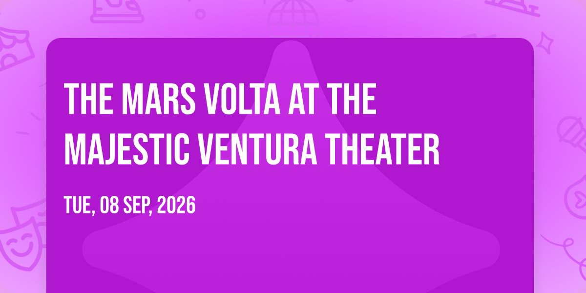 🎉 Welcome to The Mars Volta at The Majestic Ventura Theater, where the impossible becomes possible and dreams take flight! 🏛️ Join us at The Majestic Ventura Theater in the heart of Ventura, CA for an event that will redefine your expectations. 📅 On September 8th, 2026 at 08:00 PM, witness the transformation of space and time into something truly magical. ✨ It's a curated experience combining the best of innovation, entertainment, and community spirit, creating moments that will be remembered for years to come. Whether you're a first-time visitor or a seasoned enthusiast, prepare to be amazed. 🎊 Book now to ensure your place in this unforgettable experience!