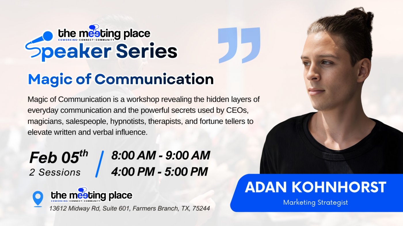 Magic of Communication is a powerful, single-session workshop that explores the hidden layers of everyday communication. Drawing inspiration from CEOs, magicians, salespeople, hypnotists, therapists, and fortune tellers, this experience reveals the subtle techniques used to influence, connect, and inspire. Participants will learn how to unlock deeper impact in both written and verbal communication, remove barriers, and drive meaningful results. Led by globally based communications consultant Adan Kohnhorst—founder of Mind Body Globe, founding member of RADII, and a certified NLP practitioner—this workshop blends real-world insight with proven strategies shaped by his work across the U.S., Asia, and Europe.