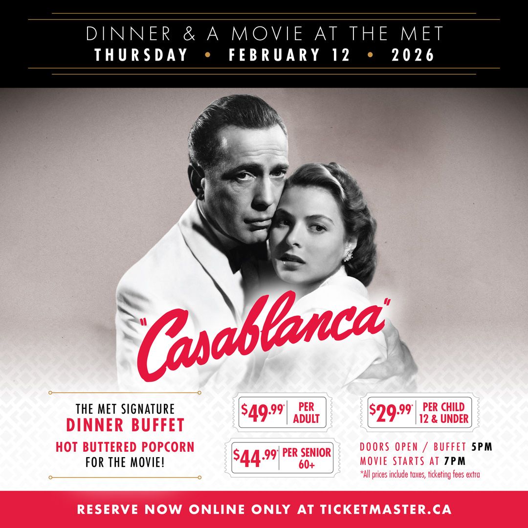 ✨ Enter a world of endless possibilities at The Met Dinner and Movie - Casablanca at Metropolitan Entertainment Centre, where every moment tells a story! 🏛️ The stunning Metropolitan Entertainment Centre in vibrant Winnipeg, MB transforms into a realm of wonder on February 13th, 2026 at 05:00 PM. 🌟 They have crafted an experience that goes beyond the ordinary, combining elements of surprise, delight, and pure entertainment. Every detail has been thoughtfully considered to ensure your journey with us is nothing short of extraordinary. 🎯 Join fellow adventure seekers and memory makers in this celebration of imagination and innovation. 🎊 Reserve your spot today and be part of something truly special!