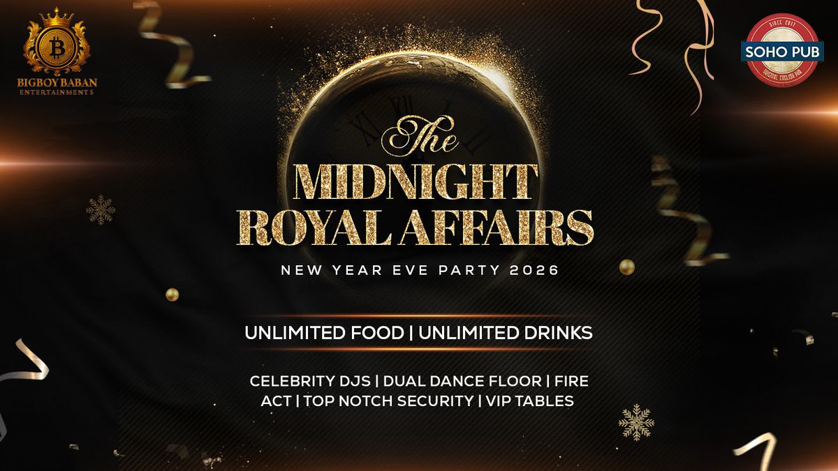 The Midnight Royal Affairs 2026 New Year Eve Party Highlights- Most Happening New Year`s Eve Party in Bengaluru- Amazing British Theme Ambience with Elite crowd.- High-energy music by top DJs Playing Best of Bollywood , UK - Punjabi , Commercial , Edm and Religional mix.- Immersive lighting and sound production with Dual Dance Floors.- Exciting midnight countdown.- Premium Unlimited Food and Drinks Package.- Premium lounge-style Seating with VIP/VVIP Table.- Top-notch security male and female bouncers. Your safety is our priority.- Family-friendly and safe environment.Welcome to the the Most Royal New Year’s Eve Party with unmatched style and energy.Step into a world of vibrant decor, with amazing production, a unique Experience like no other and non-stop fun as our live DJ sets the mood with electrifying beats all night long.As the clock ticks closer to midnight, gather around for a radiant countdown and champagne toast to welcome 2026 in glowing style.Celebrate New Years Eve with a Bang experience great music, good vibes, and unforgettable moments.Reserve your spot now and do not miss the most Royal New Year’s Eve Bash only at Soho Pub.