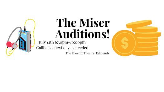 The Miser auditions will be held in individual slots on Monday July 12th from 6:30pm to 10:00pm. July 13th callbacks as needed 6:30-10pm.Email [email protected] to schedule your audition slot. (that's Theatre with and RE)