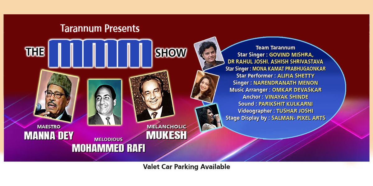Prepare for a chaste collection of legendary renditions, celebrating the timeless artistry of three of India's greatest voices: Manna Dey, Mohammed Rafi, and Mukesh. This event invites you to witness the classical wizardry of Manna Dey Saheb, the divine expression of Rafi Saheb, and the deeply emotive style of Mukeshji.