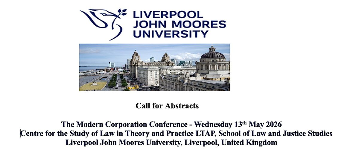 In furtherance of the objectives of the Research Development Fund of the Faculty of Society and Culture, Liverpool John Moores University, corporate law and comparative legal research enthusiasts are hereby invited to The Modern Corporation Conference, scheduled for Wednesday 13th May 2026, at Liverpool John Moores University, Liverpool, United Kingdom.