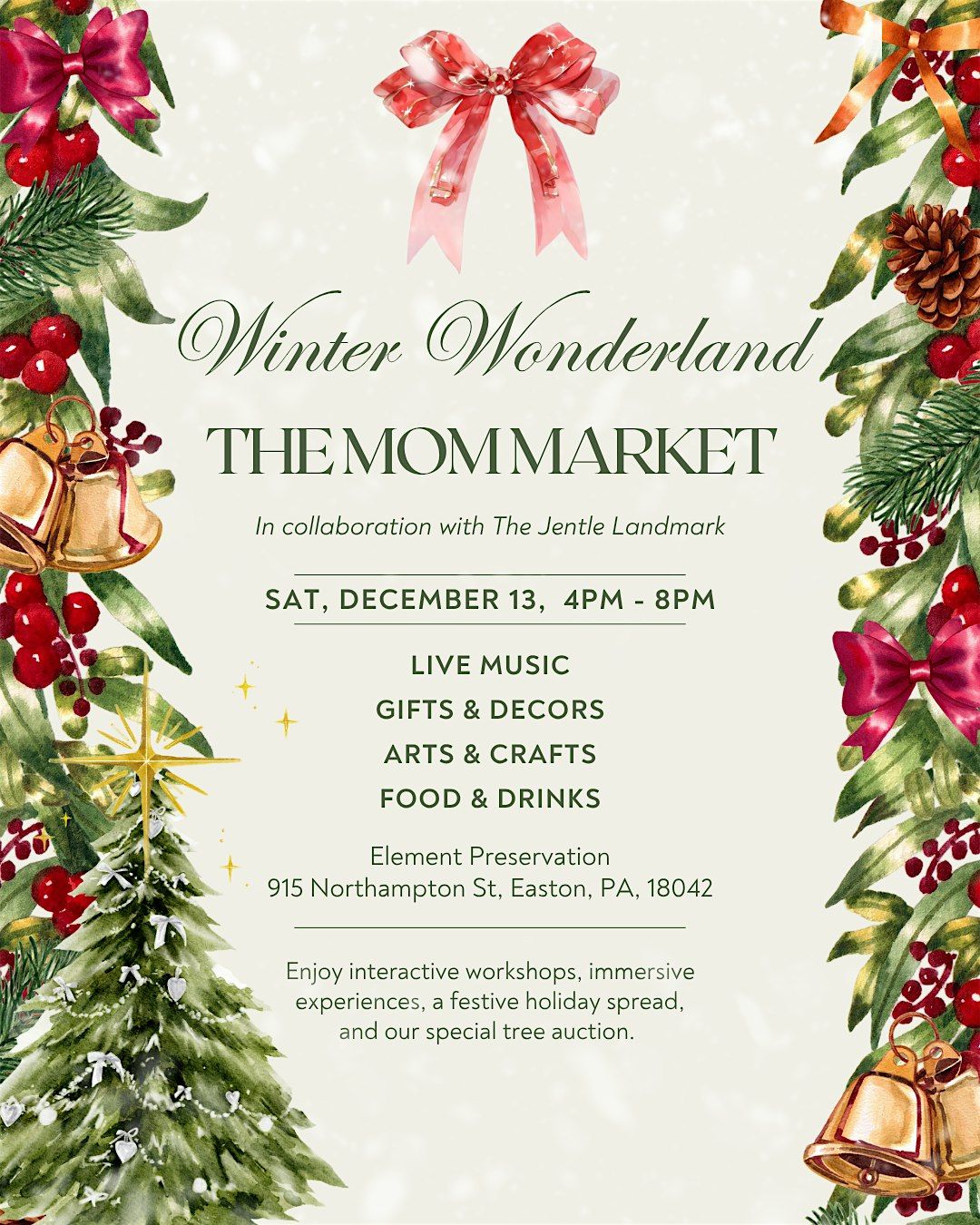 Step into a festive evening where joy sparkles in every corner and the spirit of the holiday season radiates through a transformed Winter Wonderland, as the Holiday Mom Market welcomes everyone into a beautifully adorned space filled with twinkling lights, fragrant evergreens, and a cozy fireside nook—each detail inviting you to linger and create cherished memories. Bring your family, friends, and neighbors to experience the warmth of our vibrant community, surrounded by shimmering holiday décor and the gentle hum of laughter.