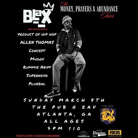 Join us on Sunday, March 8th, as The Pub @ EAV hosts the Atlanta stop of The Money, Prayers & Abundance Tour. Headlined by BLAX