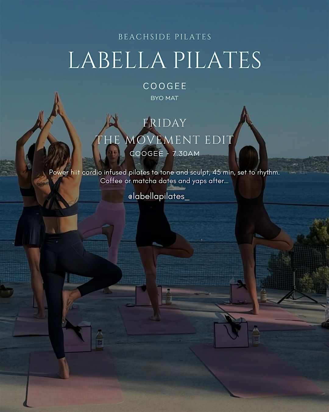 Beachside mat pilates classMovement targeting all muscle groups!
