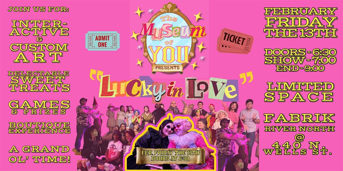 Lucky in Love is a Museum of You experience for curious couples, throuples, and singles who want to be seen, celebrated, and swept into a little romantic chaos. Part interactive performance, part intimate art market, this Friday the 13th gathering is playful, goofy, and deeply about connection.