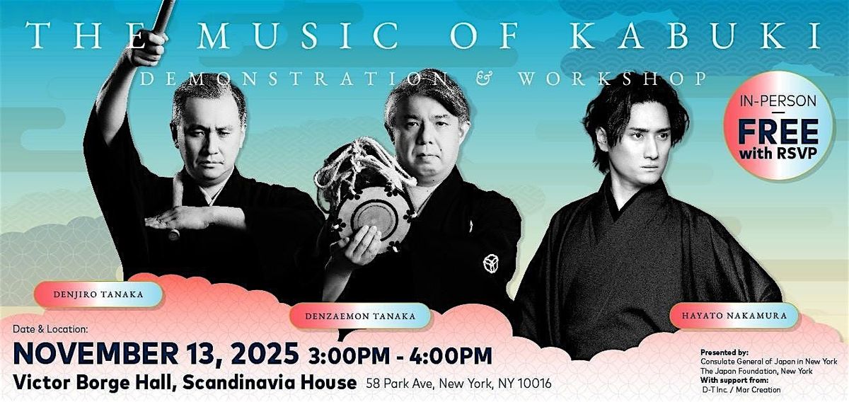 Acclaimed kabuki actor Hayato Nakamura and hayashikata (“kabuki musician”) Denzaemon Tanaka and Denjiro Tanaka with fellow kabuki musicians will give students and the public a very rare opportunity to immerse themselves in traditional Japanese music. This demonstration and workshop on the history and background of kabuki performance will include a hands-on experience where selected audience members can play a taiko drum.