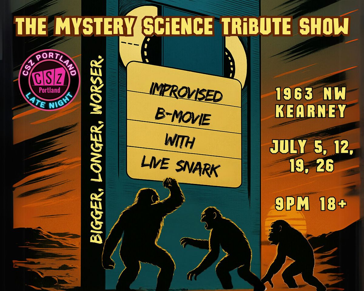 A B-movie improvised live onstage, with hilarious "snarkers" on microphones mocking it as it happens! Inspired by the beloved TV series, the Mystery Science Tribute Show is a long-running fan-favorite show. But now it's gotten the CSz Late Night treatment: we've expanded it to be full-length, added midnight-movie host characters, and made it adults-only!