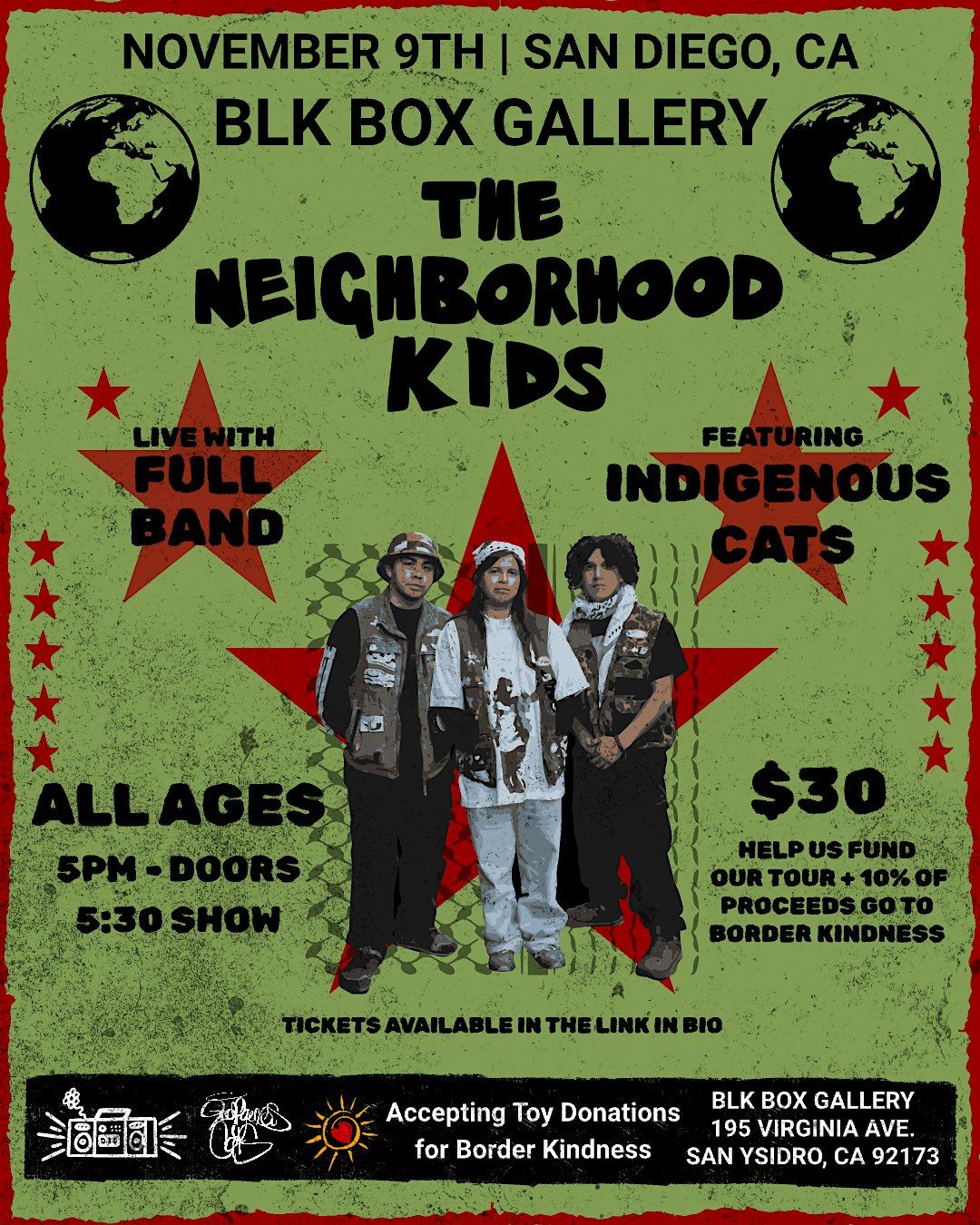 San Diego’s own The Neighborhood Kids are hitting the stage for one night only before setting off on their East Coast tour with Rage Against the Machine legend Tom Morello. Known for their high-energy performances and conscious lyricism, TNK will perform live with a full band at BLK BOX Gallery, joined by Indigenous Cats for an evening that blends music, culture, and community.