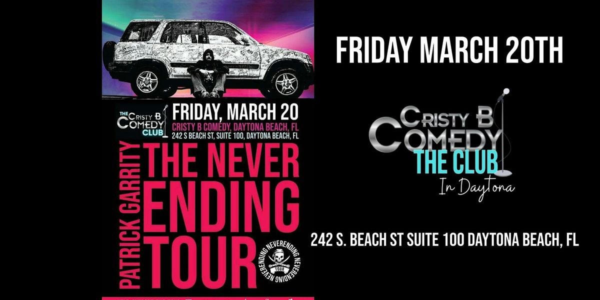 Patrick Garrity is a comedian known for his long-running comedy tour called the “Neverending Tour.” He performs at various comedy clubs, casinos, and venues across the U.S., continuously traveling from one city to the next, which is how the tour got its name.