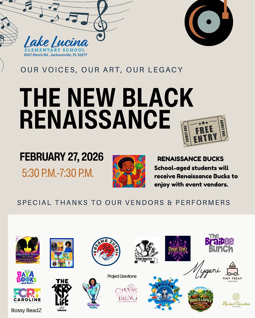 Join us at Lake Lucina Elementary School on February 27, 2026 at 5:30 PM (Eastern Time) for an awesome gathering celebrating creativity and culture. This in-person event is all about connecting, inspiring, and having a great time together. Don’t miss out on the vibes and community spirit! School aged students will receive Renaissance Bucks to spend with local vendors at the event.