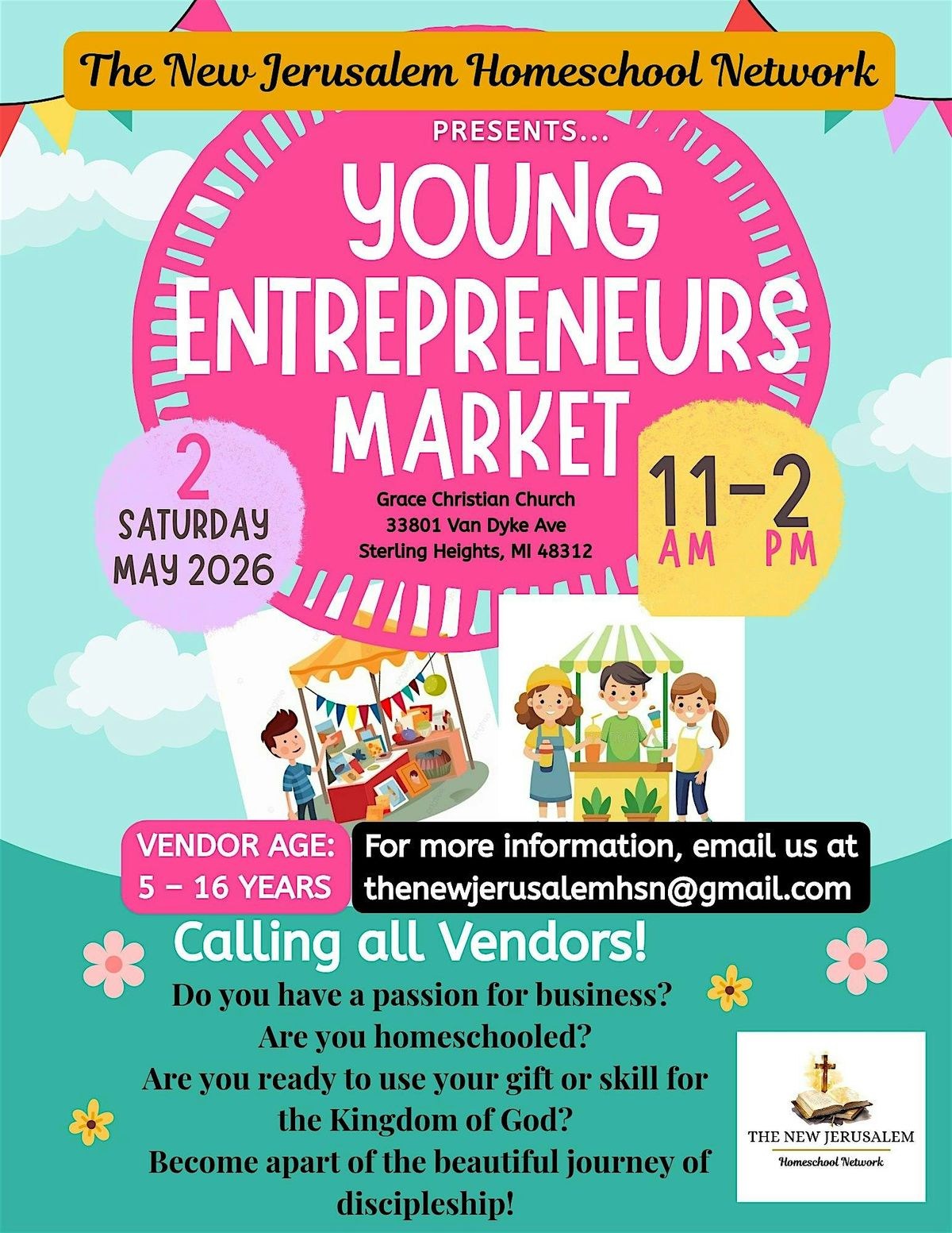Welcome to the Young Entrepreneurs Market 2026! Join us at Grace Christian Church on May 2, 2026 at 11:00 AM (Eastern Time) for a day filled with creativity and innovation.