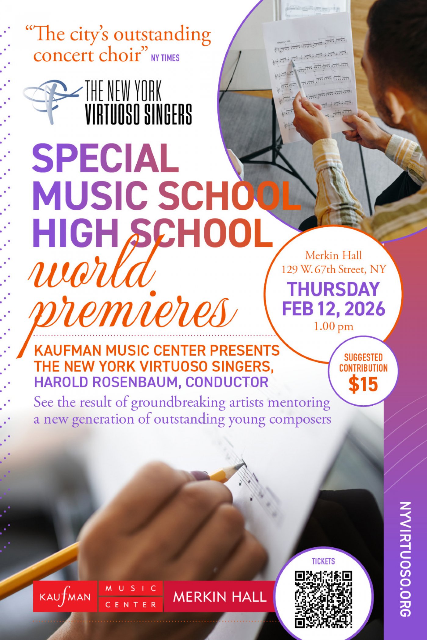 NYVS will present new choral works by young composers from Special Music School (https://www.kaufmanmusiccenter.org/sms/about/), Including Alexander Azatyan-Rosenblatt, Alexei Jourin, Amalia Shapira, Amil Abumrad, Daniel Ruo Chen, Dorian Tabb, Max Bissonnette, Nathaniel Mullodzhanov, Olive Welles, Skye Vescovi and Teal Meyers.
