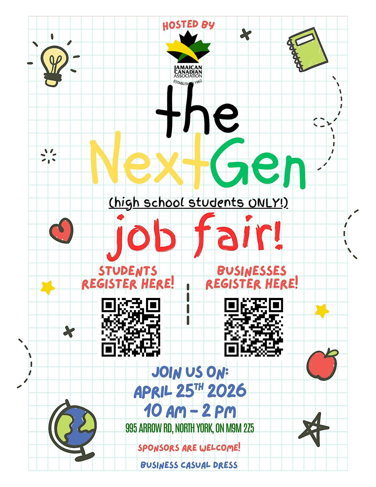 Join us for The NextGen Job Fair, proudly hosted by the Jamaican Canadian Association—an exciting opportunity designed exclusively for high school students to explore and apply to their future summer jobs.