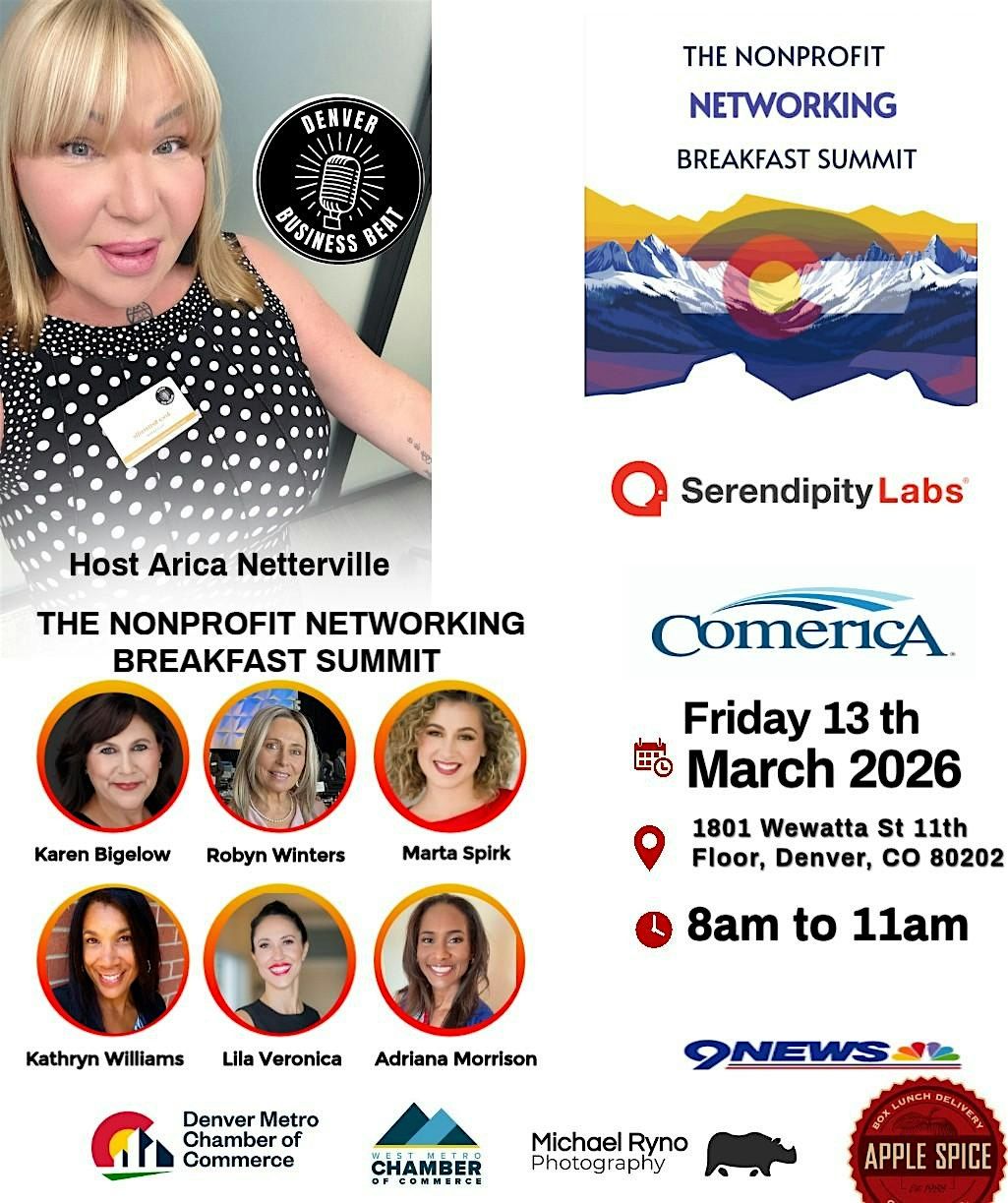 The highly anticipated Nonprofit Networking Breakfast Summit 2026 is officially set for Friday, March 13 th, from 8:00 a.m. to 11:00 a.m. at Serendipity Labs – Denver LoDo, 11th Floor, 1801 Wewatta St, Denver, CO 80202.