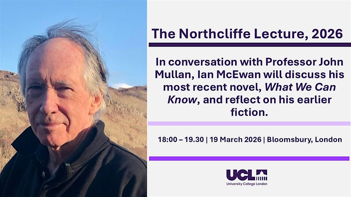 This year’s Northcliffe Lecture, hosted by UCL’s Department of English Language and Literature, will be given by Ian McEwan. In conversation with Professor John Mullan, he will discuss his most recent novel, What We Can Know, and reflect on his earlier fiction. Discussion will range from his earliest stories across five decades of fictional experiment.