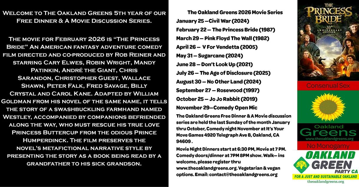 THE OAKLAND GREENS invite you too the 2026 February FREE DINNER AND A MOVIE “The Princess Bride” (1987) COMMUNITY DISSCUSSION NIGHT. Sunday February 22 with dinner starting at 6:30 PM movie starts 7 PM. Doors closed at 7:30 PM. These free community events are hosted in partnership with “It’s Your Move Games” 4920 Telegraph Ave suite B, Oakland, CA 94609