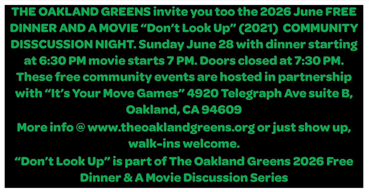 THE OAKLAND GREENS invite you too the 2026 February FREE DINNER AND A MOVIE “Don’t Look Up (2021)” COMMUNITY DISSCUSSION NIGHT. Sunday June 28 with dinner starting at 6:30 PM movie starts 7 PM. Doors closed at 7:30 PM. These free community events are hosted in partnership with “It’s Your Move Games” 4920 Telegraph Ave suite B, Oakland, CA 94609