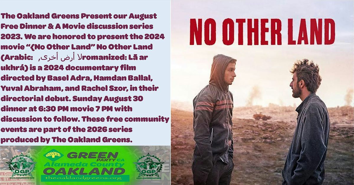 THE OAKLAND GREENS invite you too the 2026 August FREE DINNER AND A MOVIE “No Other Land” (2024) COMMUNITY DISSCUSSION NIGHT. Sunday August 30 with dinner starting at 6:30 PM movie starts 7 PM. Doors closed at 7:30 PM. These free community events are hosted in partnership with “It’s Your Move Games” 4920 Telegraph Ave suite B, Oakland, CA 94609