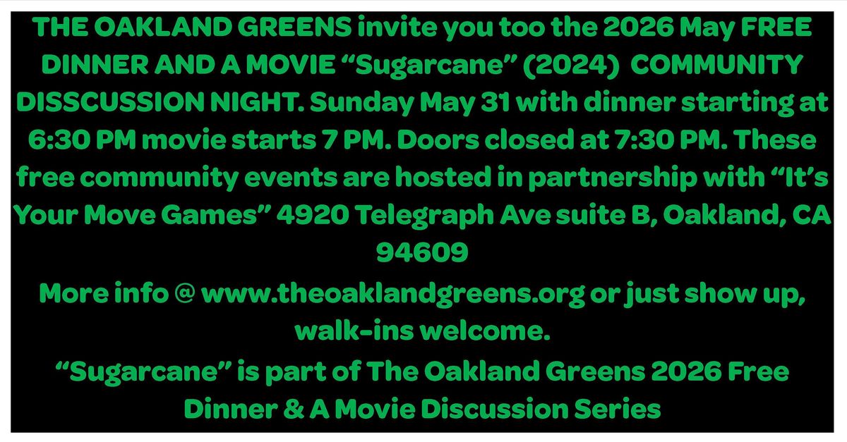 THE OAKLAND GREENS invite you too the 2026 May FREE DINNER AND A MOVIE “Sugarcane” (2024) COMMUNITY DISSCUSSION NIGHT. Sunday May 31 with dinner starting at 6:30 PM movie starts 7 PM. Doors closed at 7:30 PM. These free community events are hosted in partnership with “It’s Your Move Games” 4920 Telegraph Ave suite B, Oakland, CA 94609