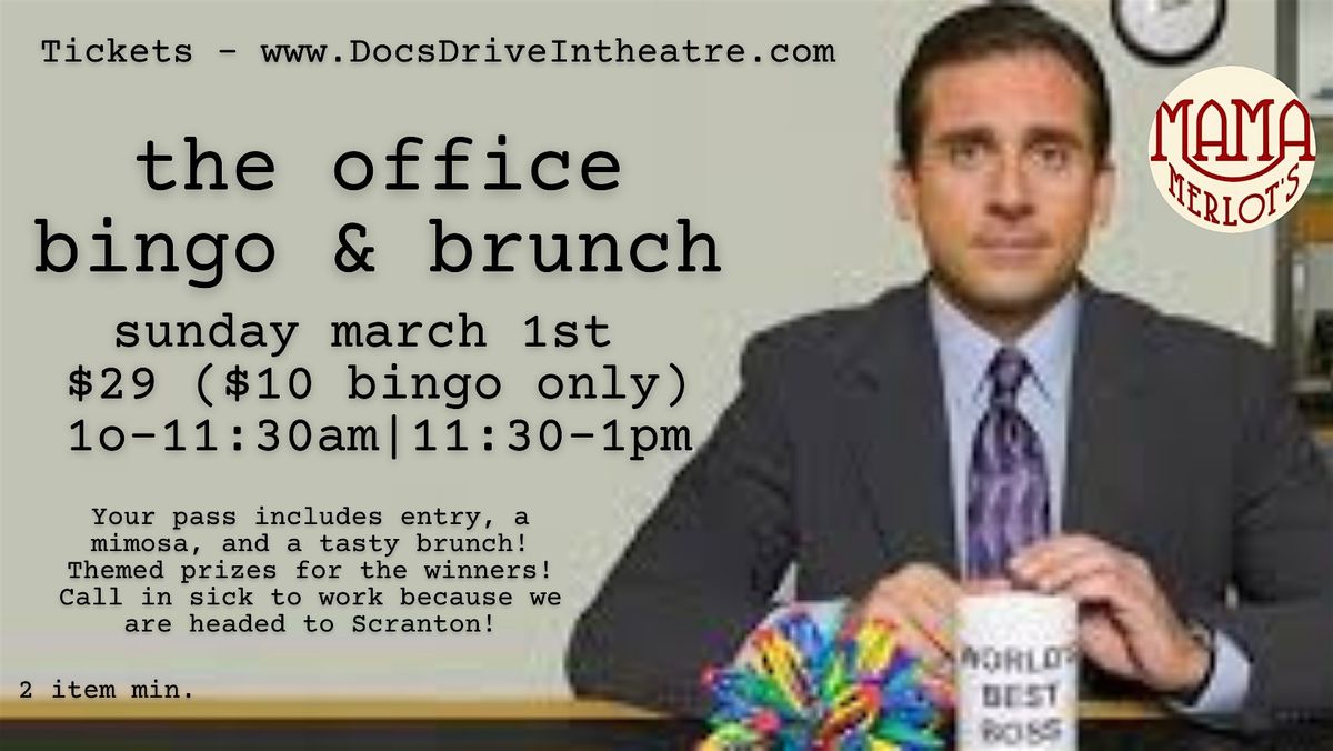 Welcome to The Office Bingo & Brunch at Mama Merlot's Speakeasy! Get ready for a fun-filled morning on March 1, 2026 at 10:00 AM or 11:30am