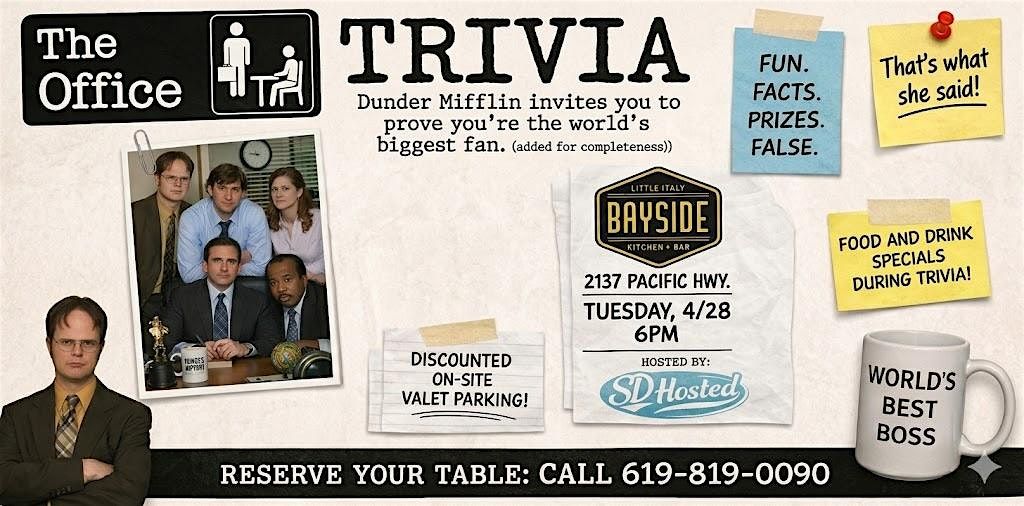 On Tuesday, April 28th at 6 PM, head to Bayside Kitchen & Bar for a night of The Office trivia that’s as chaotic and iconic as Dunder Mifflin itself. This Office-themed trivia night dives into everything from awkward meetings and pranks to Dundies, romances, and legendary one-liners.