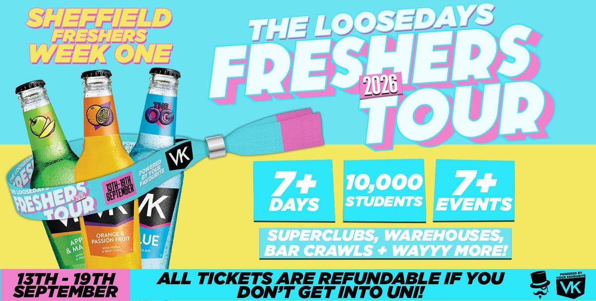 🎟 THE LOOSEDAYS SHEFFIELD FRESHERS TOUR | POWERED BY VK | 7+ DAYS... 7+ EVENTS 🎟The UK's number one events company LOOSEDAYS, brings you 7+ phenomenal events across 7+ days in the best & most in-demand nightclubs throughout Sheffield! 💖🎉🤩 Powered by VK, this Freshers Week Band is your All-Access Pass with everything on that you will need for the best & most enjoyable Freshers Week experience.