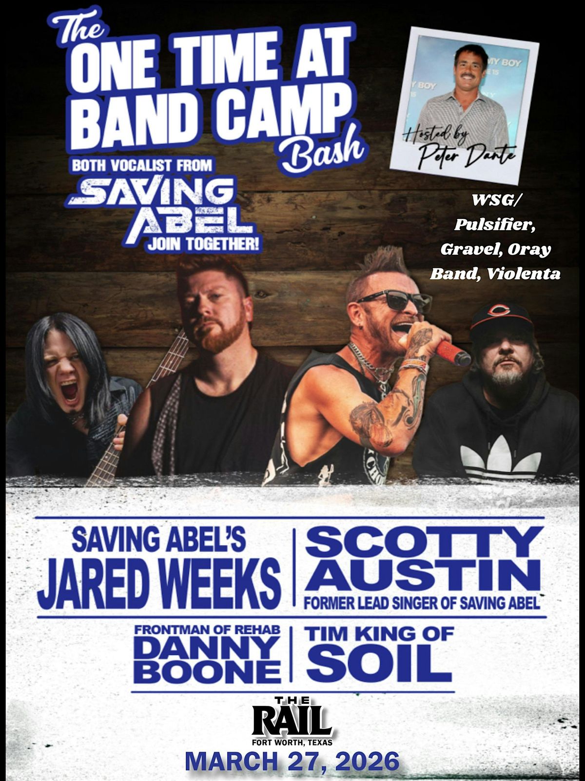 Join us at The Rail on 3/27 for THE ONE TIME AT BAND CAMP BASH featuring both vocalist of Saving Abel and a ton more. Hosted by Peter Dante!About this Event