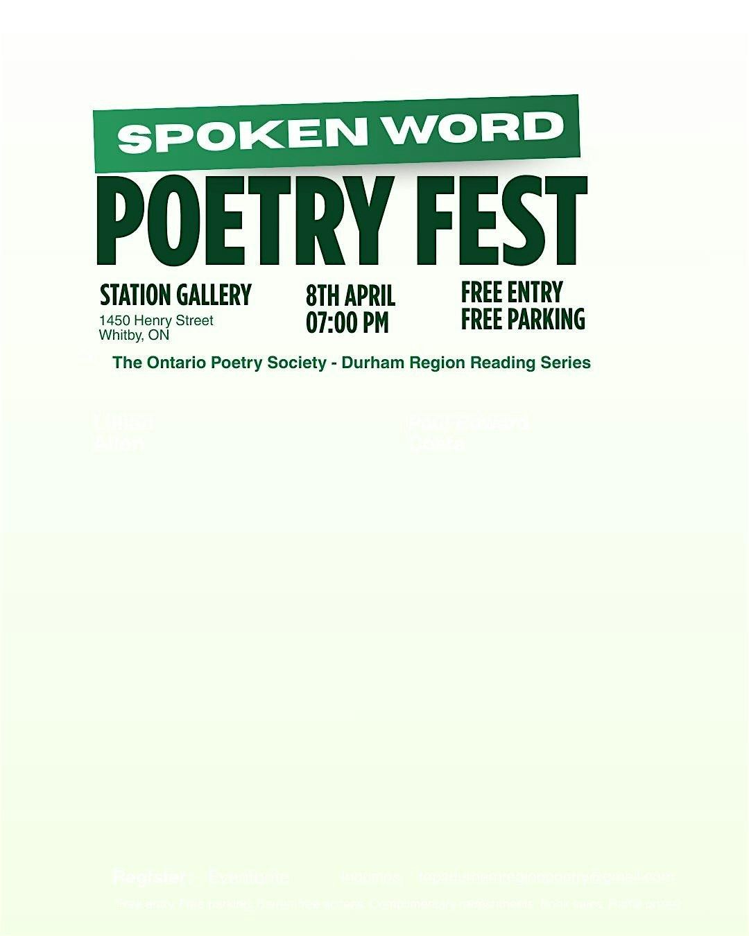 Brief Description of Event: The Spoken Word Poetry Festival at Station Gallery is a multifaceted event to celebrate National Poetry Month, the arts, and foster an appreciation for diversity and freedom of expression. This free event is open to the public, with donations gratefully accepted in support of Youth Programs at Station Gallery; an artistic cultural hub located in Whitby, Ontario.