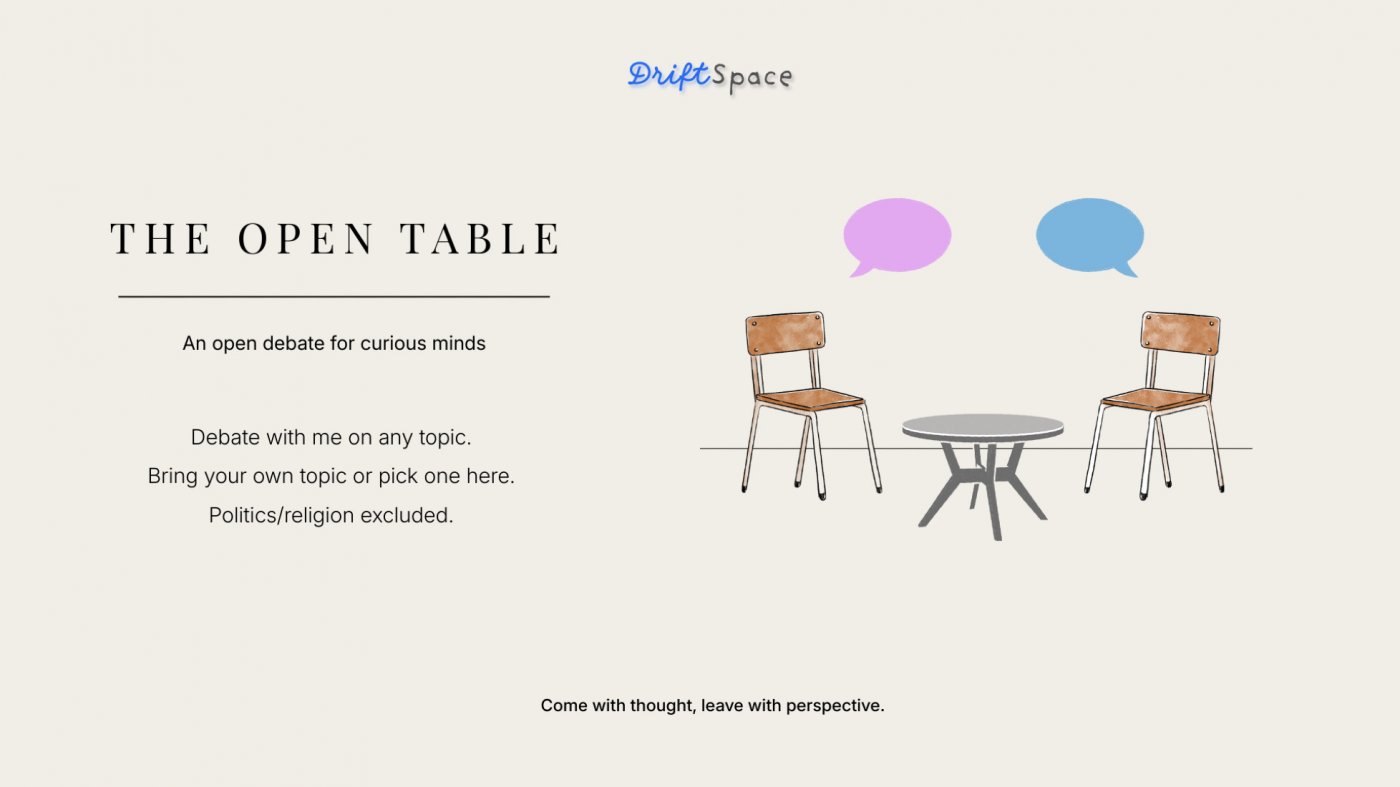 A friendly space where ideas are explored. You can bring a thought you believe in, question one you’re unsure about, and learn. Disagreeing is welcome, disrespect isn’t.