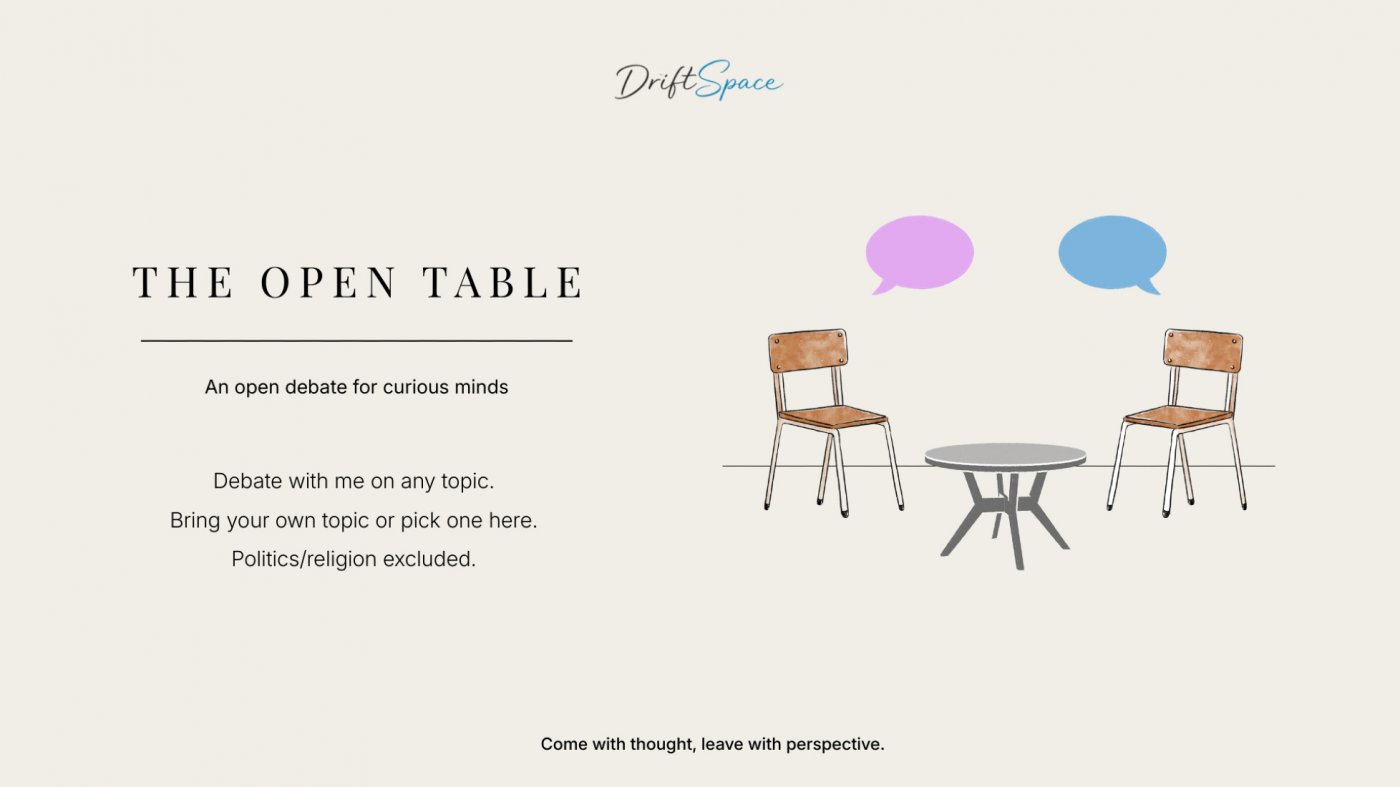 A friendly space where ideas are explored. You can bring a thought you believe in, question one you’re unsure about, and learn. Disagreeing is welcome, disrespect isn’t.