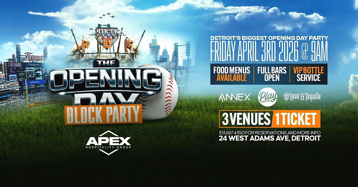 Opening day in Detroit is upon us which means it's the biggest day in the city for baseball fans and the party people that come to downtown Detroit to celebrate. In honor of that we produce the largest annual Opening Day Block Party with 3 venues for 1 ticket at The Annex, Love & Tequila, and the brand new Play. All located in one building!