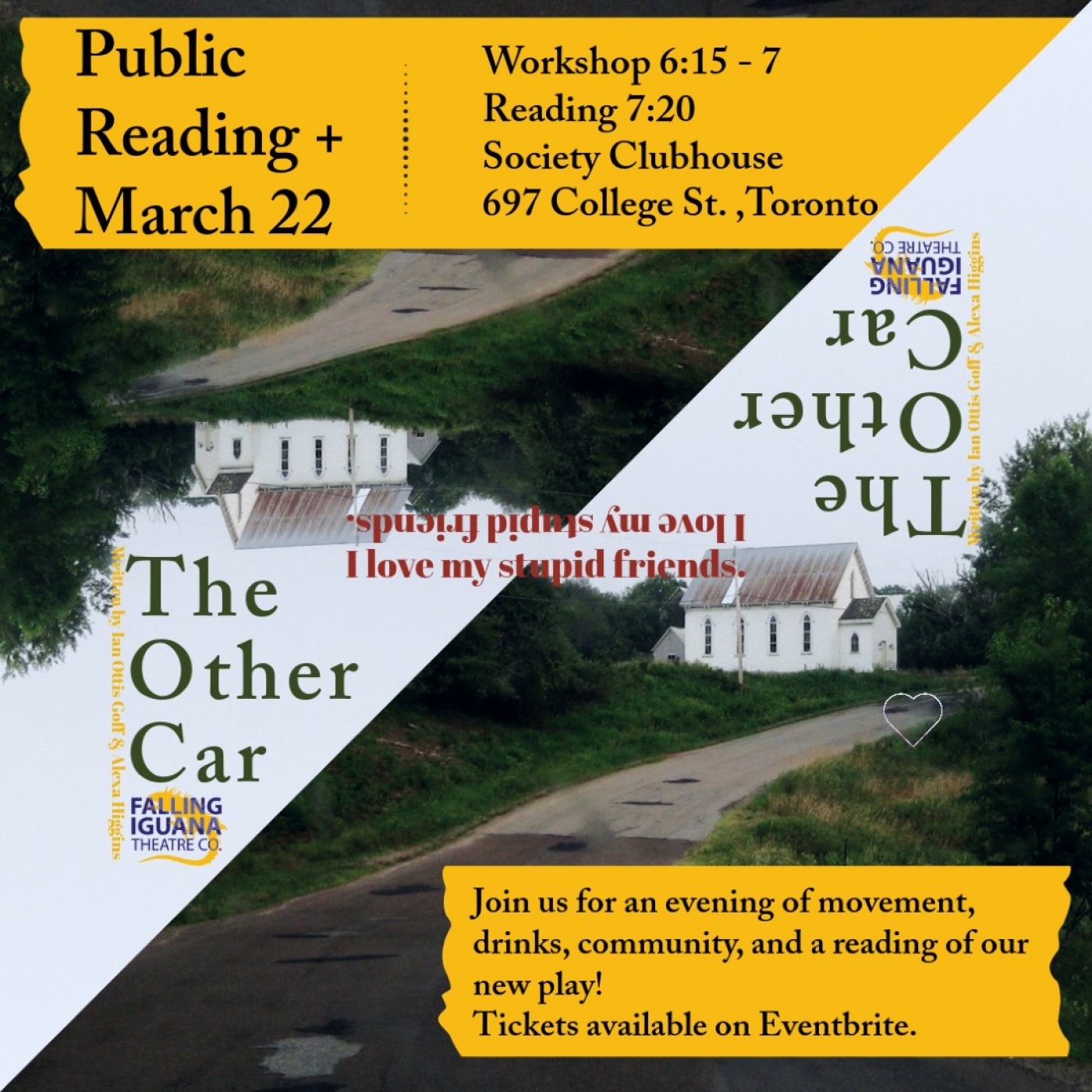 We will be hosting a reading of The Other Car at Society Clubhouse in Toronto on Sunday, March
