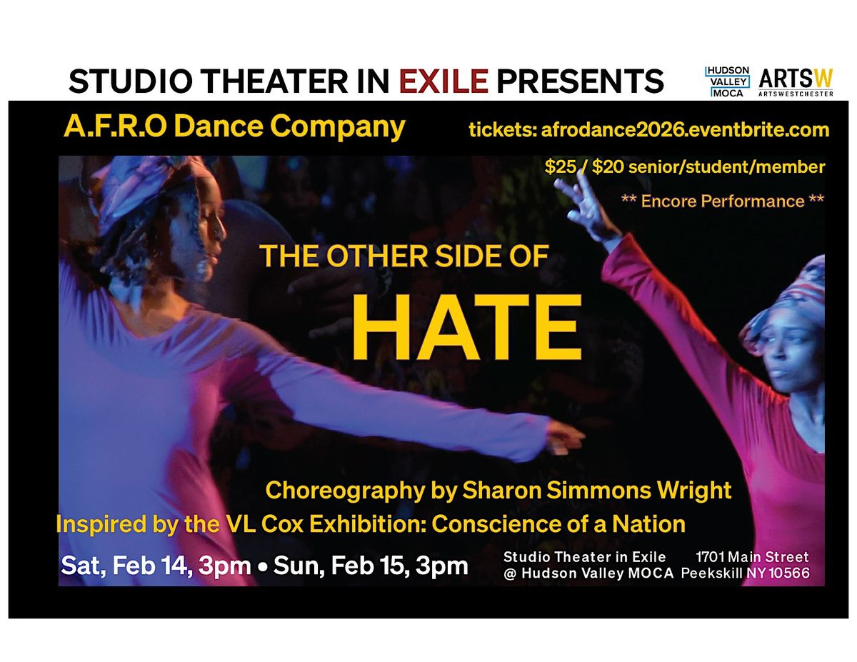 Studio Theater is Exile will be presenting A.F.R.O Dance Company in a dance performance, The Other Side of Hate, choreographed by Sharon Simmons Wright on Saturday, February 14th (valentines day) @ 3pm and Sunday, February 15th @ 3pm.