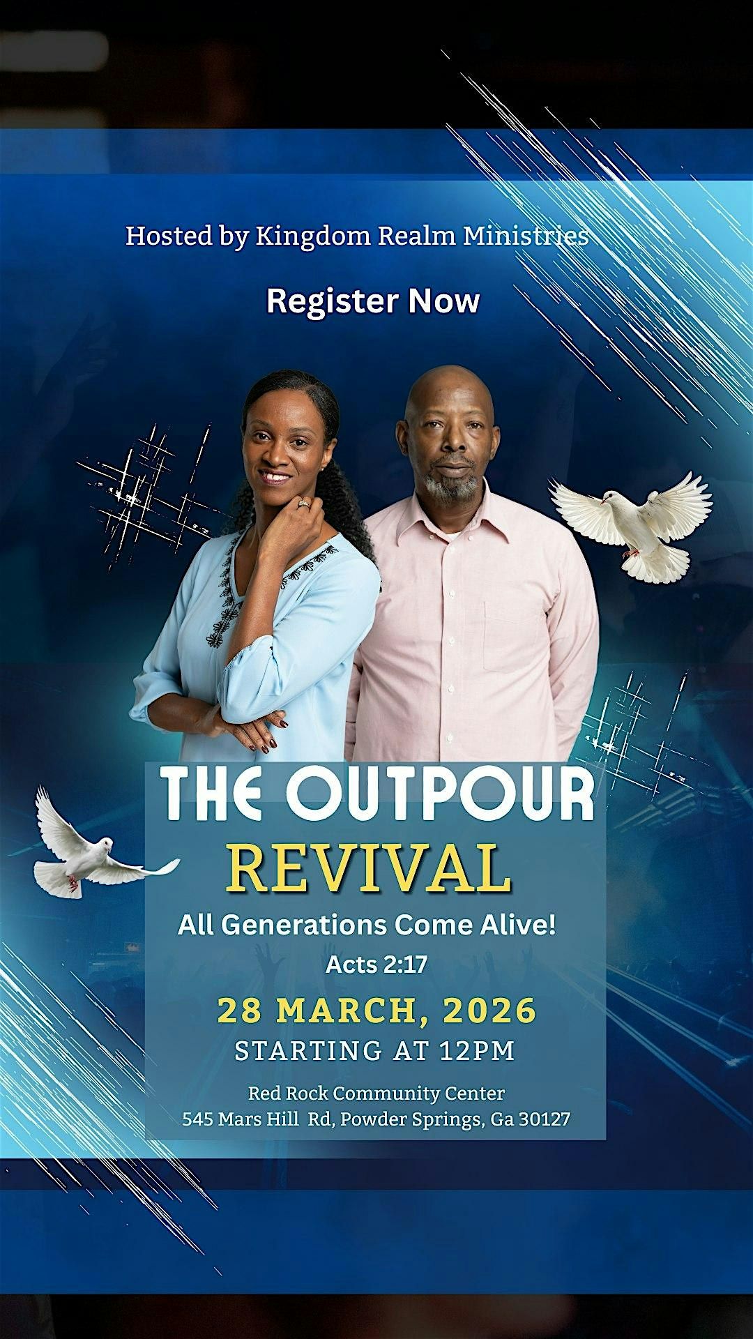 Get ready for an unforgettable in-person experience! The Outpour Revival is all about multi-generations seeking God together in prayer, soaking, and prophetic declarations. Whether you're searching for restoration, connection, or just time to soak in God's presence, this event is for you. Don’t miss out on the fire and heart of The Outpour Revival — it’s where lives are transformed and spirits lifted. See you there!