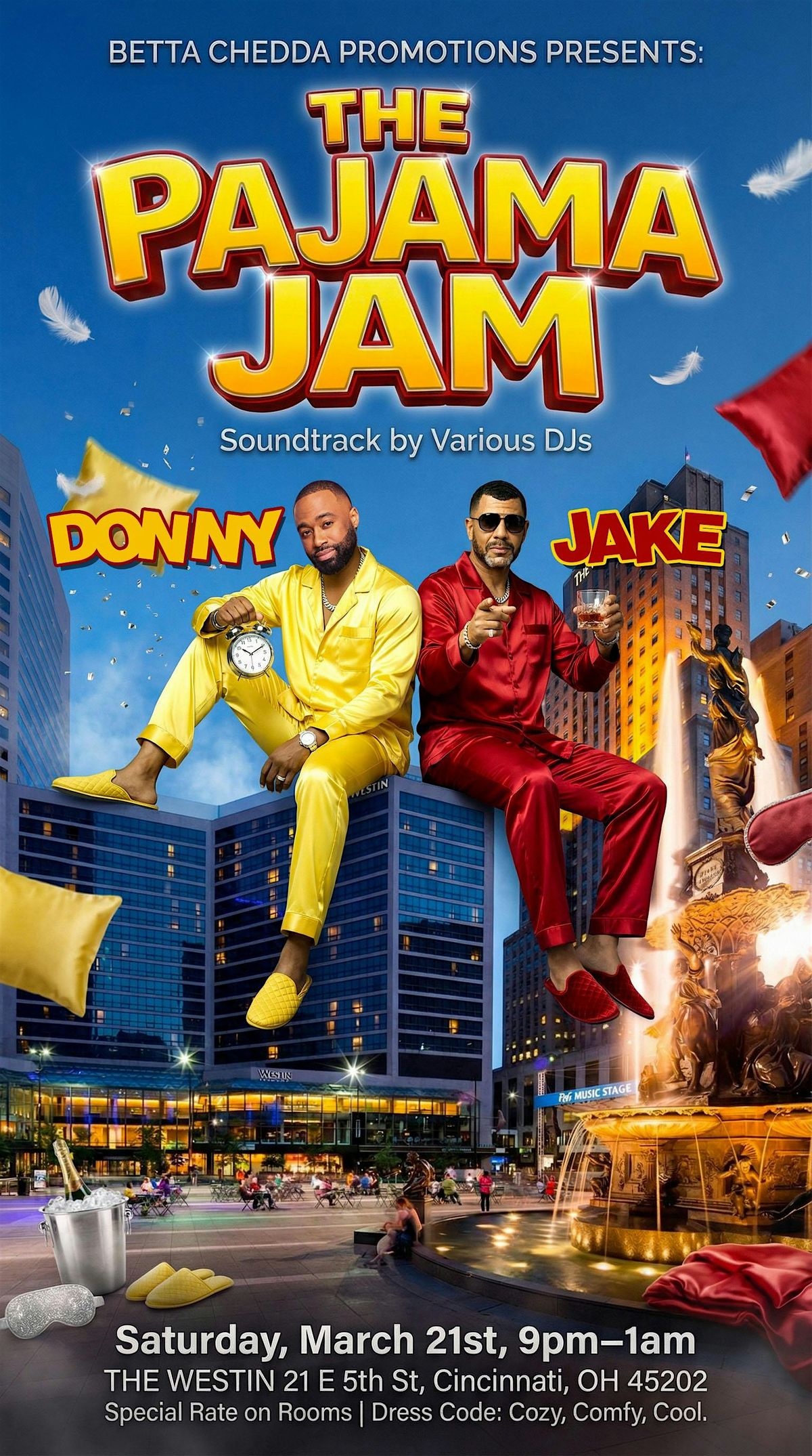 Betta Chedda Promotions presents THE PAJAMA JAM at The Westin! We're bringing multiple DJs setting the vibe, grown & sexy atmosphere, and yes...we're giving out Betta Chedda money you can use toward drinks at the bar! Now let's be clear about the DRESS CODE: COMFY. COZY. COOL. This is your time to step out in your flyest pajamas - silk sets, matching sets, robes, onesies... and yes, house shoes are absolutely welcome. Make it a whole experience and book a room! There's a special discounted room rate available, so secure your stay and turn the night into a staycation. No rushoing home - just vibes.