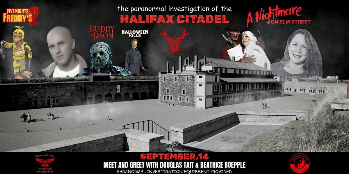 Step inside the famously haunted Halifax Citadel once-in-a-lifetime paranormal investigation—led by none other than Douglas Tait, known to play Jason Vorhees in Jason vs Freddy, Michael Myers in Halloween Kills, Withered Chica in Five Nights at Freddy's 2 & various other film roles as well as, Beatrice Boepple. Beatrice is known for A Nightmare on Elm Street franchise as Freddy Krueger s mother, Amanda Krueger.