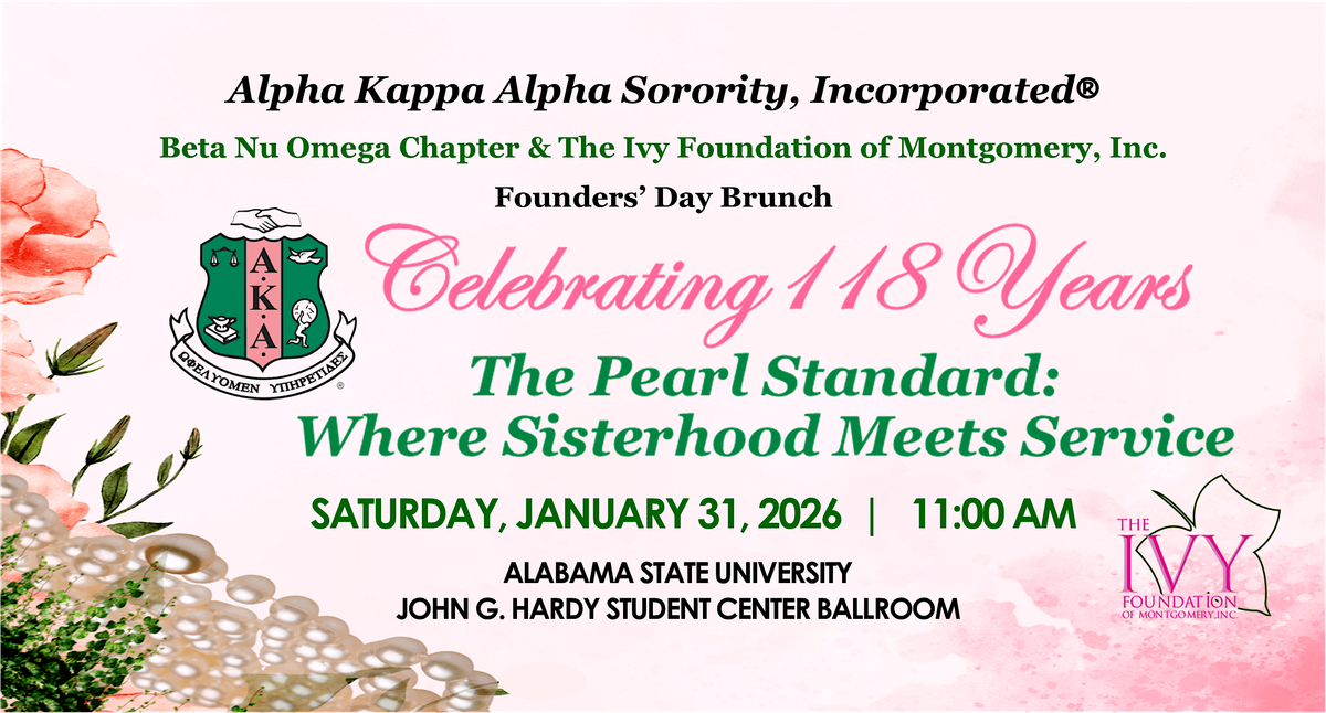 Guests will experience an inspiring program highlighting the mission, impact, and continued work of Alpha Kappa Alpha Sorority, Incorporated®, alongside meaningful community engagement made possible through our partnership with the Ivy Foundation of Montgomery, Inc. Proceeds from this celebration will support charitable initiatives and programs that uplift and serve the Montgomery community and beyond.