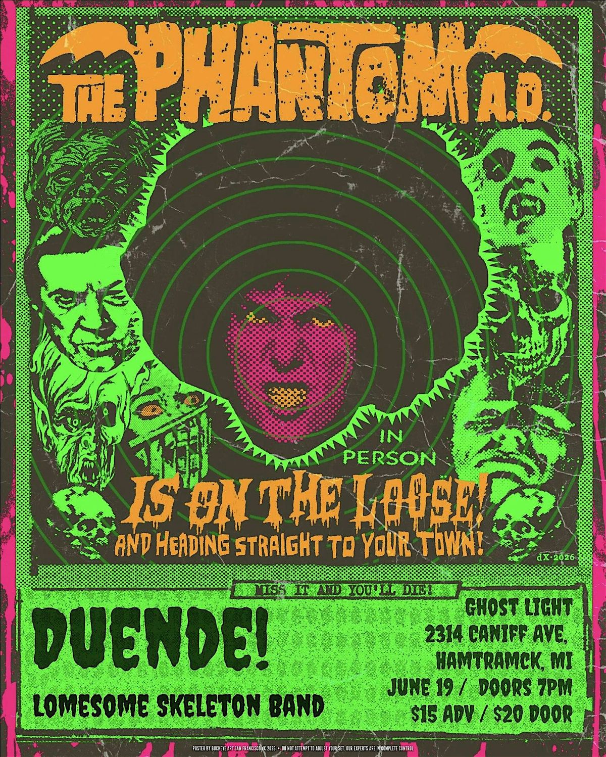 More than a mere performance, The Phantom A.D. delivers an electrifying spectacle. Fronted by The Phantom—a larger-than-life figure draped in his signature cape and afro—the band has pioneered a unique musical genre known as Ghoulish Rock N’ Roll. Seamlessly blending Surf, Garage, and Rockabilly elements with the frenzied, forbidden fun of an old horror movie, they’ve established a worldwide following.