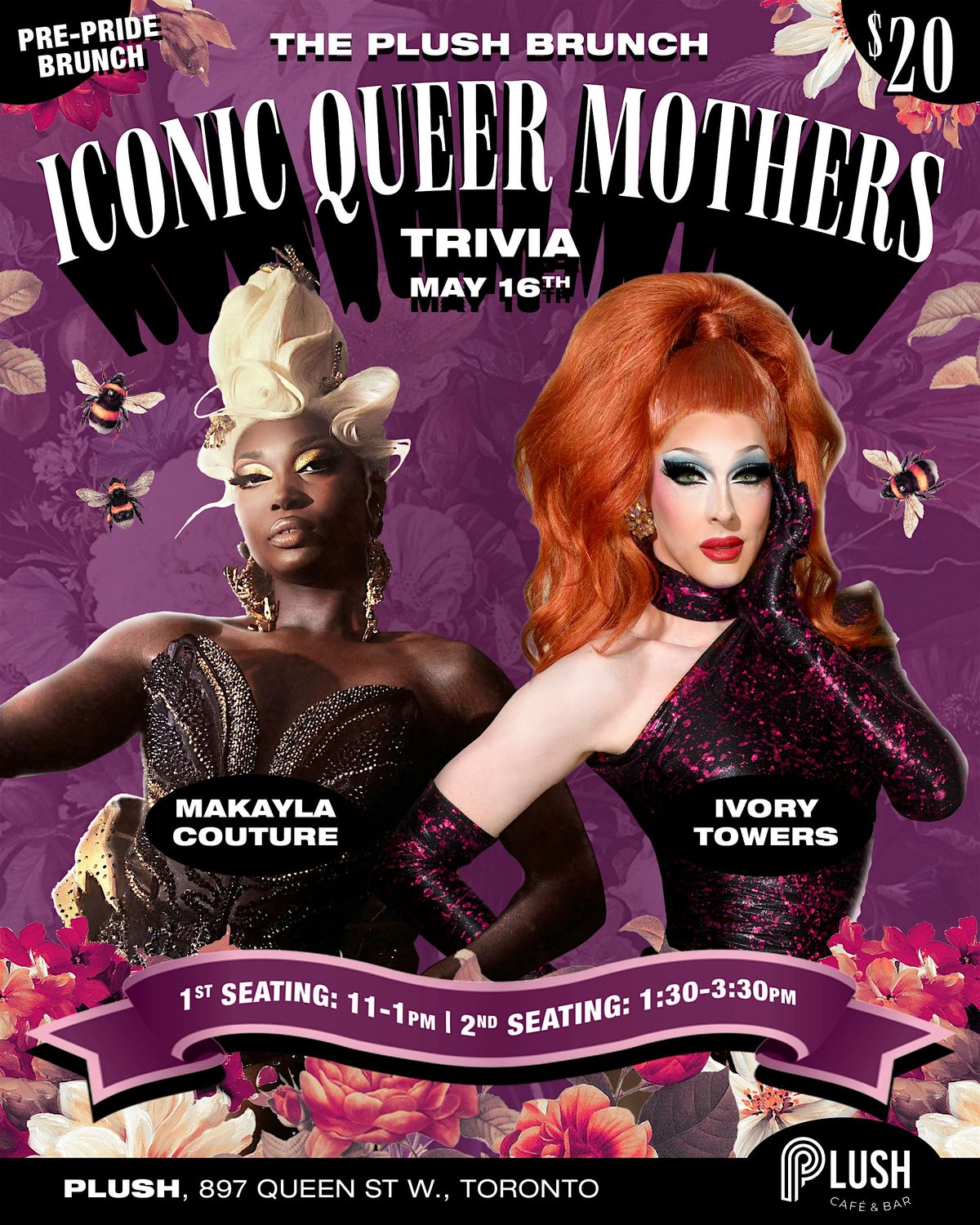 Join us at Plush Café & Bar for an unforgettable Pre-Pride Brunch celebrating the legends, icons, and trailblazers of queer culture. Hosted by the fabulous Makayla Couture and Ivory Towers, this high-energy event brings together trivia, drag excellence, and vibes all in one.