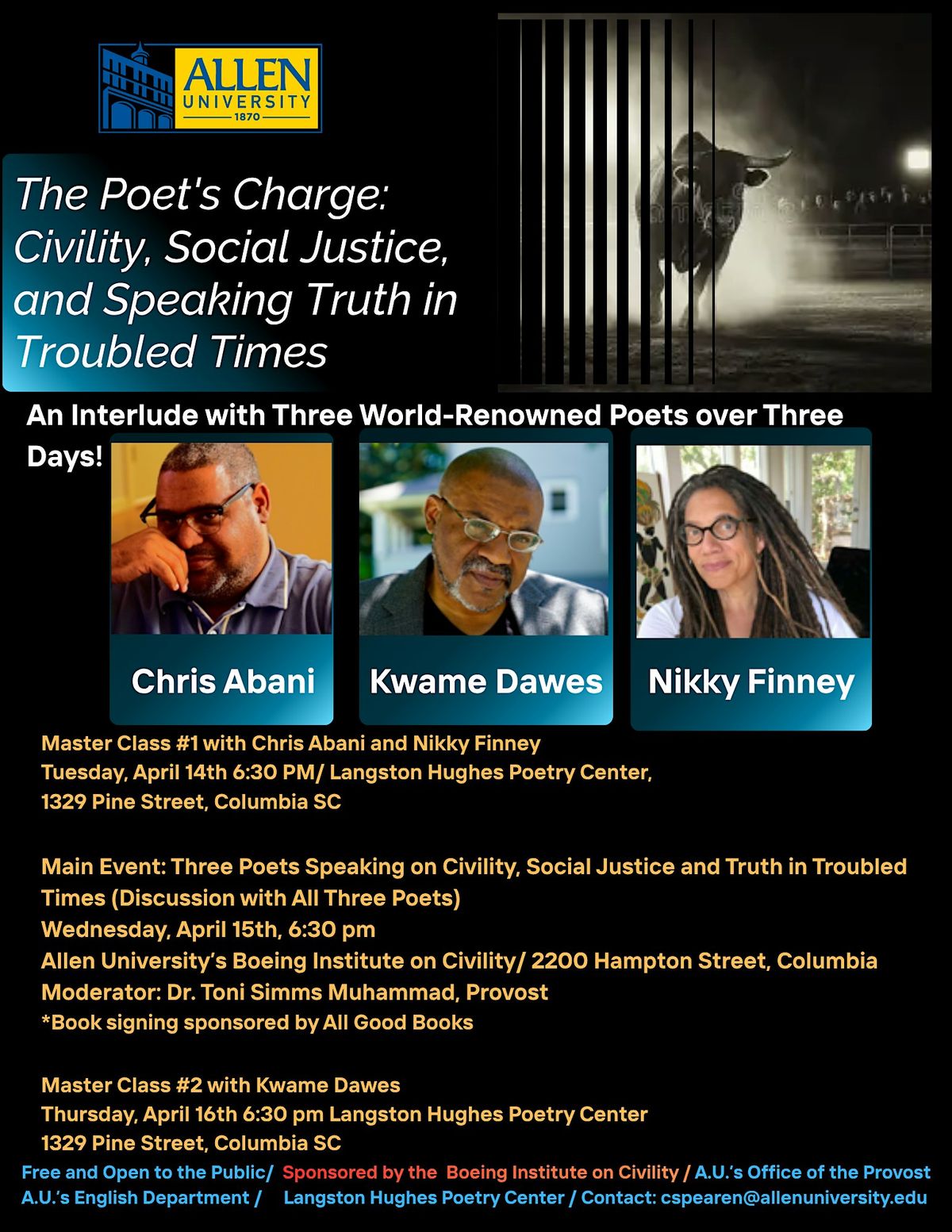 Sponsored by Allen Univeristy, the Langston Hughes Poetry Center, and the Boeing Institute for Civility. For more information visit or email [email protected]